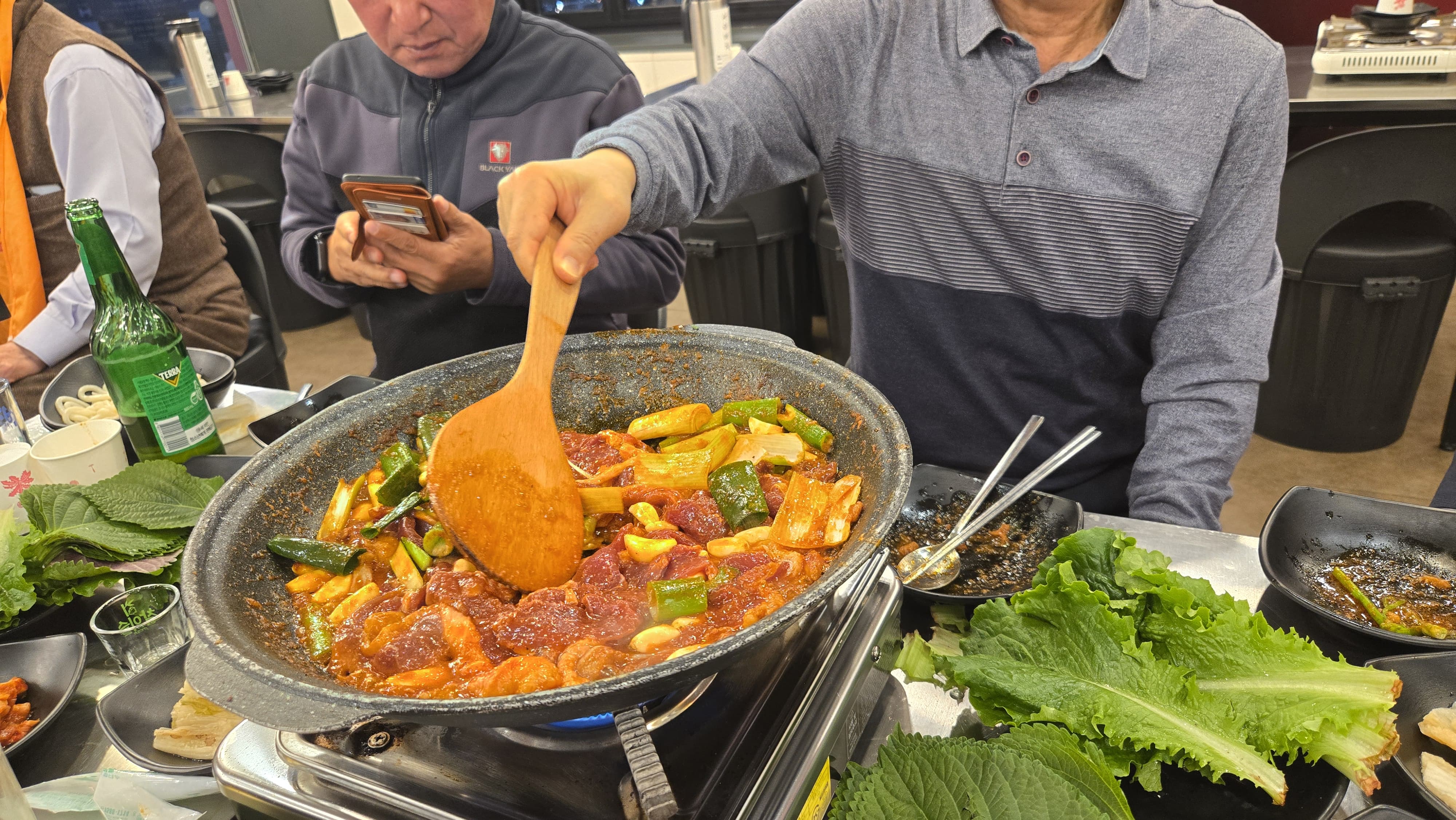 상추, 깻잎, 고추, 마늘 등 쌈 채소는 셀프바에서 무제한으로 이용할 수 있습니다. 채소 상태도 신선했고 셀프바 주변 정리 상태가 깔끔해 위생 면에서도 신뢰가 갔습니다. 매장 전체적으로 바닥, 테이블, 주방 쪽까지 정돈이 잘 되어 있어 단체 모임 장소로 선택해도 부담이 없습니다.