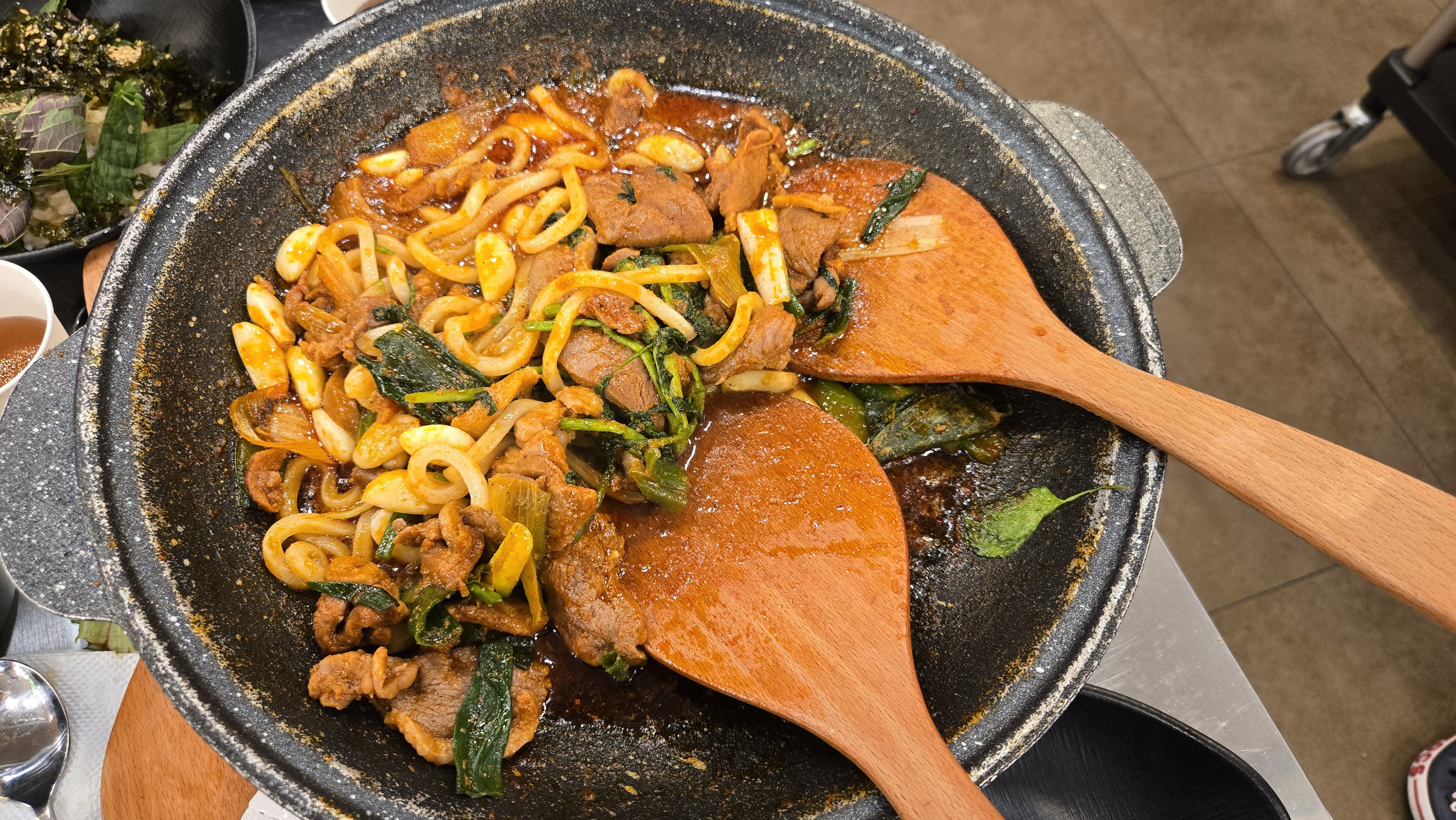 오리주물럭과 우동을 어느 정도 먹고 나면 마무리는 역시 볶음밥입니다. 양념이 잘 배어 있는 철판에 밥을 볶아주는데, 김가루와 채소가 어우러져 마지막까지 만족스러운 맛을 남깁니다. 배가 꽤 부른 상태였음에도 볶음밥은 남기지 않고 깔끔하게 비우게 되었습니다.